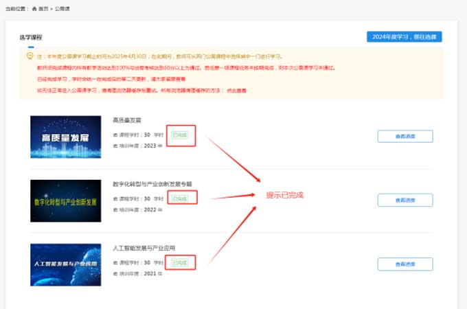 2024年公需课学习截止时间为2025年4月30日,逾期不予补学,请在截止时间前完成学习,同时为避免出现平台卡顿情况,请尽量避免高峰期学习。